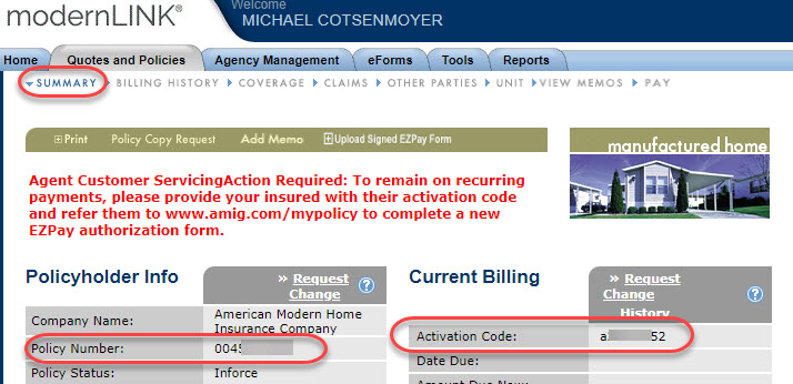 Instruct your customers to go to (link is external)amig.com/mypolicy and have them click ” Get Started Now” and follow the prompts. They’ll need their Policy Number and Activation Code–found on a recent invoice or mailing. You can also find their activation numbers for them in both modernLINK and AMSuite.