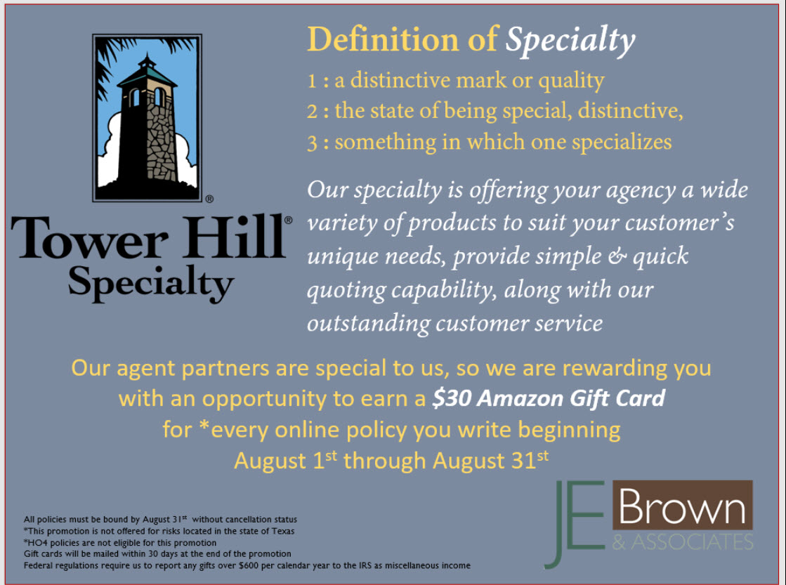 Tower Hill Specialty joins the JEBrown lineup, expanding our Arizona offering! As a niche provider of specialty personal lines property insurance, Tower Hill Specialty offers residential insurance coverage for risks that are often underserved by conventional national carriers. THS is rated B++ by A.M. Best. If you’re already a JEB producer, and licensed in AZ, you’ll see the new button in your dashboard.